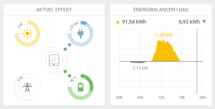 Herunder et eksempel på en solskinsdag i marts, hvor batteripakken kl. 23 fortsat driver husets forbrug frem til ca. kl. 3 om morgenen. Ved 9-tiden kan solcellerne igen levere tilstrækkeligt til både husets drift og opladning på batterierne.