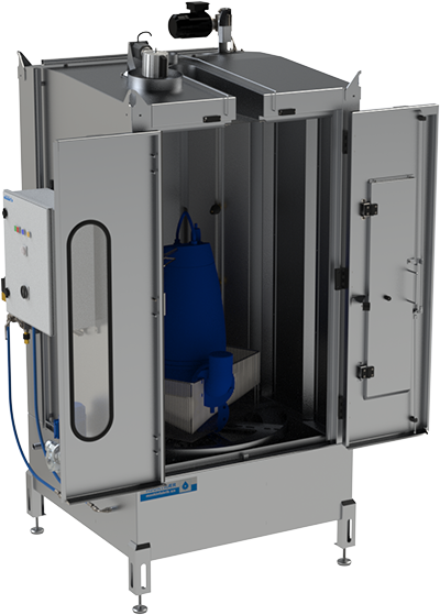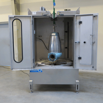 Under vask oplyses kabinen og man kan følge processen gennem det indbyggede vindue. Et kranspor i kabinens top giver let adgang for håndtering af tunge vaskeemner med kran.