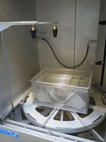 En timer indstilles på den ønskede vasketid, startknappen aktiveres, hvorefter en frekvensstyret drejeskammel roterer vaskeemnet forbi vaskedyserne, mens der spules i en vertikal bevægelse for optimal dækning.