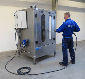Under vask oplyses kabinen og man kan følge processen gennem det indbyggede vindue. Et kranspor i kabinens top giver let adgang for håndtering af tunge vaskeemner med kran.